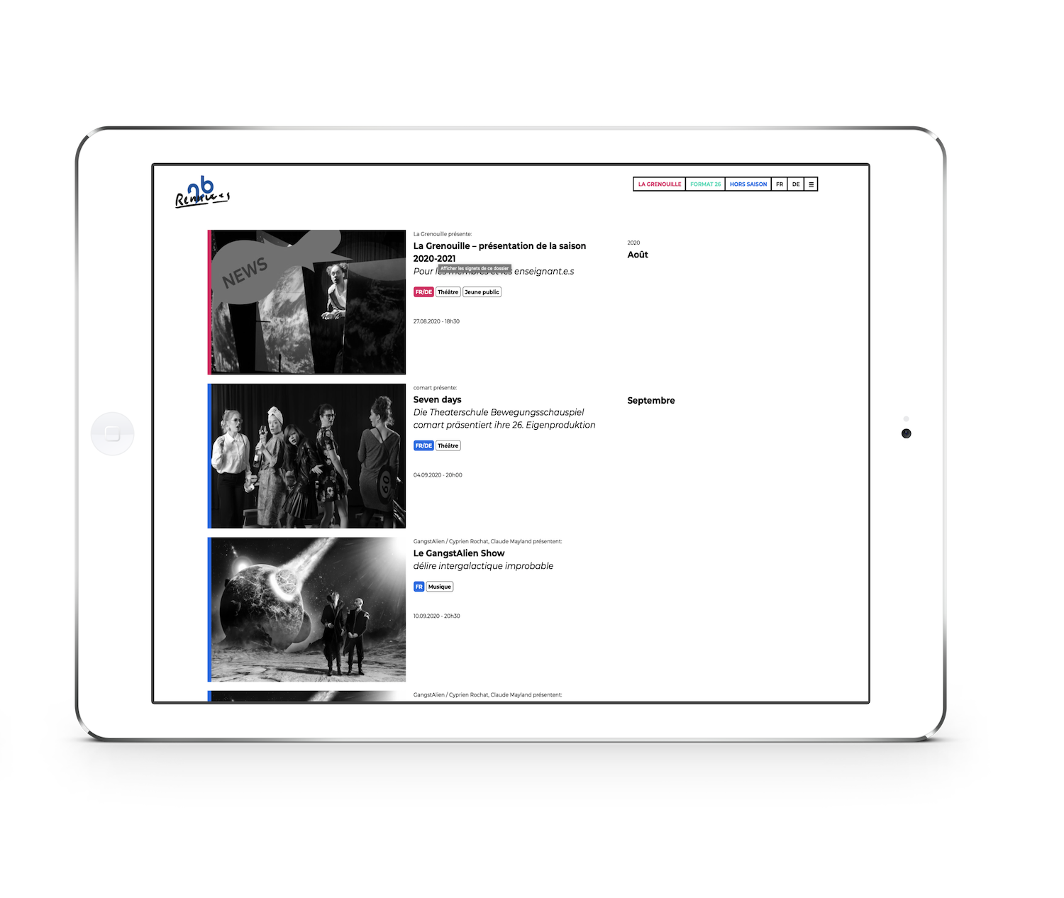 Nous avons mis en place un site bilingue sur lequel sont publiés les événements qui se déroulent dans ce lieu, qu'ils soient programmés par La Grenouille (responsable artistiquement et opérationnellement de tout le domaine «théâtre et danse pour jeune pub Visiter le site